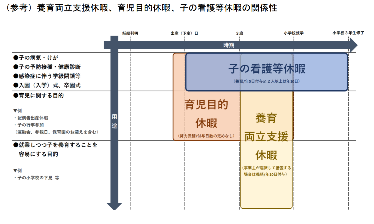 4.取得理由 休暇の利用目的は、仕事と子育ての両立を支援するものであれば自由です。 例えば、次のような場面で利用できます。 ・子どもの入園式・卒園式、授業参観への参加 ・予防接種や通院の付き添い ・保育園・幼稚園の行事、慣らし保育対応 ・発熱など、急な看護が必要な場合 など