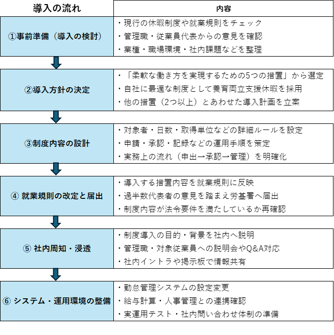『養育両立支援休暇』を導入するにあたっては、以下の流れを組んでいく必要があります。