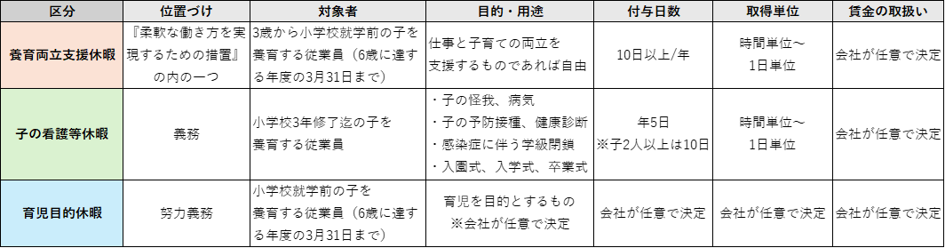 育児に関する休暇制度には、「養育両立支援休暇」のほかにも「子の看護等休暇」や「育児目的休暇」などがあります。 似たような内容の部分もあるため、従業員から「どの休暇を使えばいいの?」と質問されるケースも少なくありません。 スムーズな運用のためには、それぞれの制度の違いをわかりやすく整理しておくことが大切です。 それぞれの制度の違いとしては、以下の通りになります。