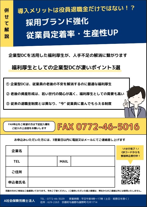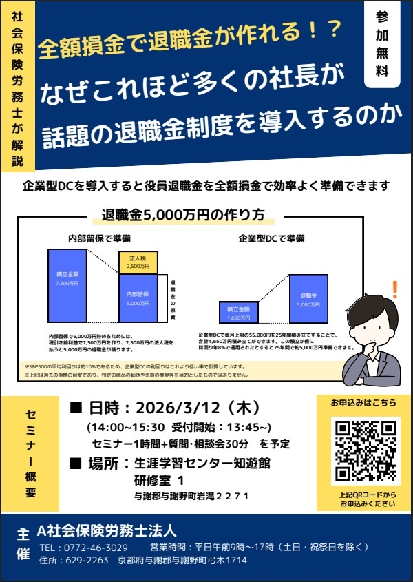 企業型DC勉強会 開催日時 2026年3月12日(木) セミナー一覧に戻る 全額損金で退職金が作れる!?なぜこれほど多くの社長が話題の退職金制度を導入するのか【企業DC勉強会】日 程:2026年3月12日(木)時 間:14:00~15:30場 所:生涯学習センター知遊館 研修室 1 京都府与謝郡与謝野町岩滝2271