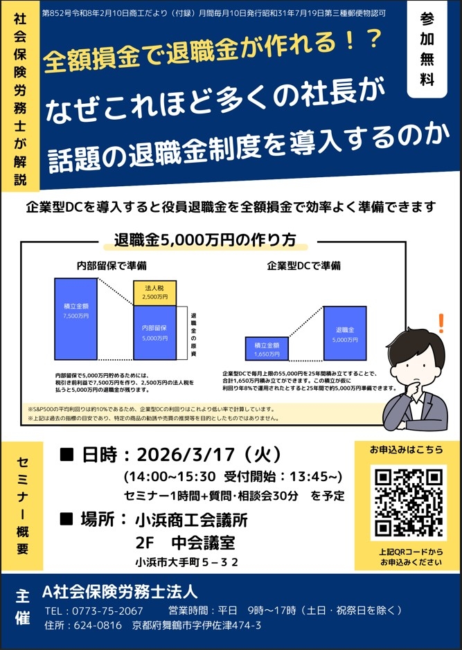 企業型DC勉強会 開催日時 2026年3月17日(火) セミナー一覧に戻る 全額損金で退職金が作れる!?なぜこれほど多くの社長が話題の退職金制度を導入するのか【企業DC勉強会】日 程:2026年3月17日(火)時 間:14:00~15:30場 所:小浜商工会議所 2F 中会議室 福井県小浜市大手町5−32