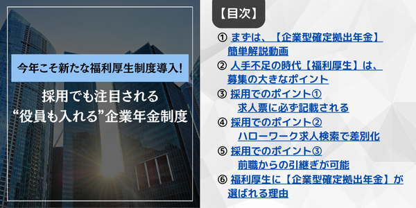 このコラムでは、人事・労務に関する様々なQ&Aや法改正情報、助成金・補助金などの新着ニュースをお届けしてまいります。 今回のテーマは、「今年こそ新たな福利厚生制度導入!採用でも注目される"役員も入れる"企業年金制度」です。 昨今、どのような業種でも人手不足が叫ばれる中、どのような採用活動を行い人手を確保するかは企業の重要な課題となっています。 本日は、採用時の「福利厚生」に着目し、役員も加入可能な福利厚生制度「企業型確定拠出年金」についてご案内します。 福利厚生としての側面だけはなく、税制優遇などメリットもたくさんございます。