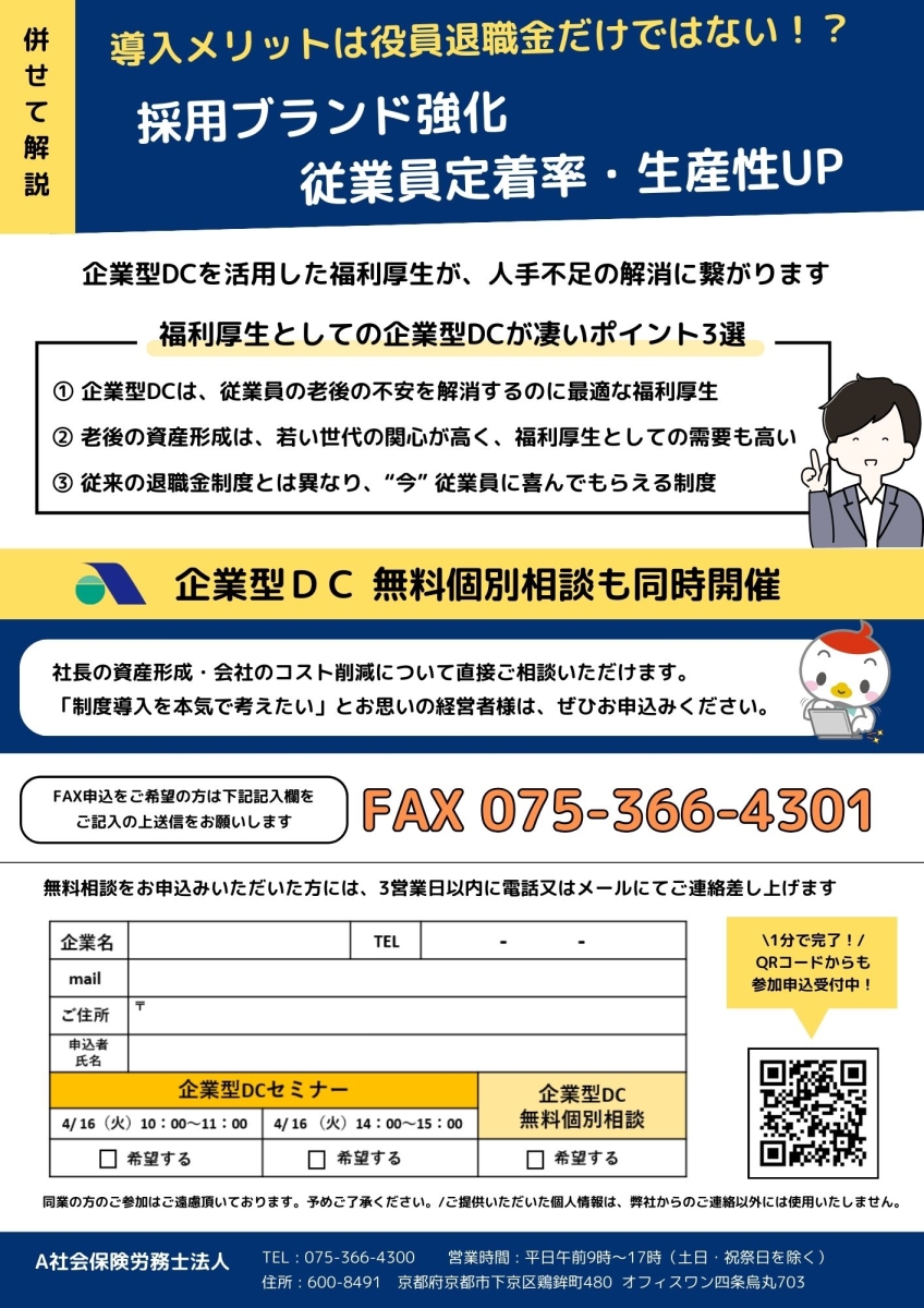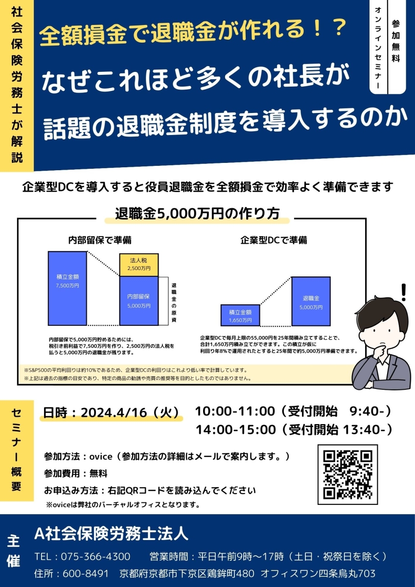 企業型DCセミナー ~なぜこれほど多くの社長が話題の退職金制度を導入するのか~ 開催日時 2024年4月16日(火) セミナー一覧に戻る 2024年4月16日(火) 【午前】10:00~11:00【午後】14:00~15:00全額損金で役員の退職金を作れる話題の退職金制度を社会保険労務士が丁寧に解説!『企業型DCセミナー』開催!