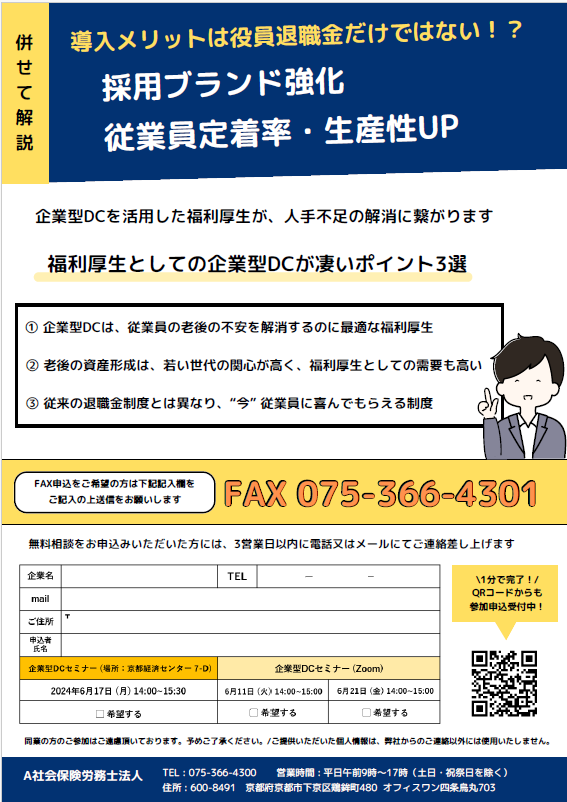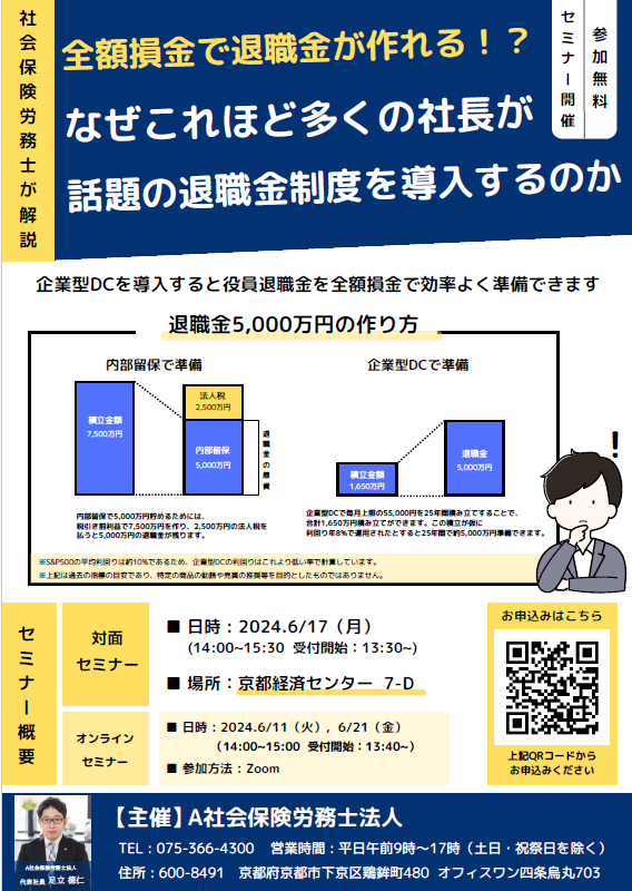 企業型DCセミナー ~なぜこれほど多くの社長が話題の退職金制度を導入するのか~ 開催日時 2024年6月 セミナー一覧に戻る 全額損金で役員の退職金を作れる話題の退職金制度を社会保険労務士が丁寧に解説!『企業型DCセミナー』開催! 【対面セミナー】 日時:2024年6月17日(月) 14:00-15:30 場所:京都経済センター 7-D 【オンラインセミナー】 日時:2024年6月11日(火曜)、6月21日(金) 14:00-15:00 参加方法:Zoom