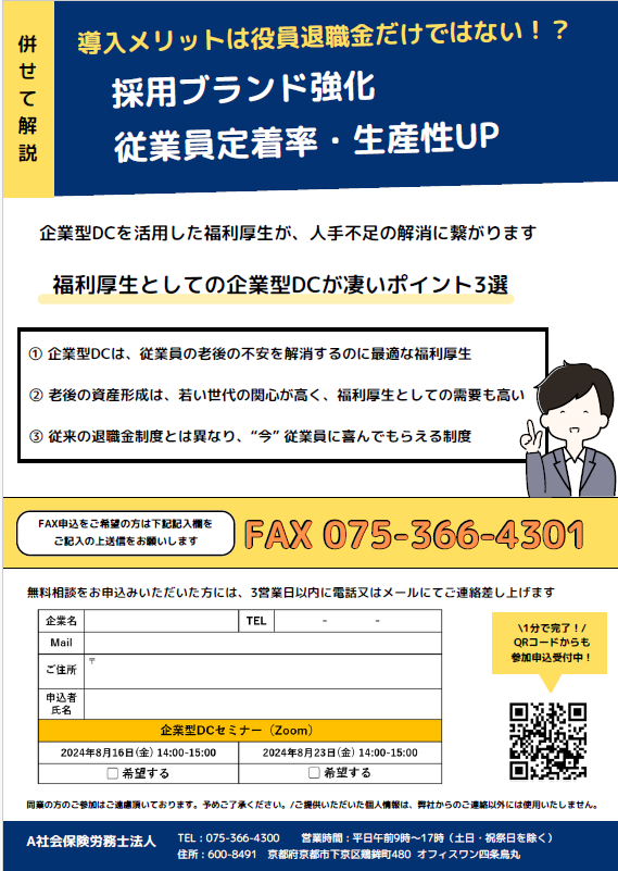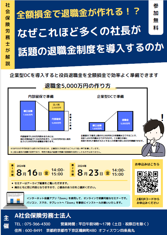 企業型DCセミナー ~なぜこれほど多くの社長が話題の退職金制度を導入するのか~ 開催日時 2024年8月16日(金),23日(金) 14:00-15:00 セミナー一覧に戻る 全額損金で役員の退職金を作れる話題の退職金制度を社会保険労務士が丁寧に解説!『企業型DCセミナー』開催! 【アーカイブ配信セミナー】 日時:2024年8月16日(金)、8月23日(金) 14:00-15:00 参加方法:Zoom
