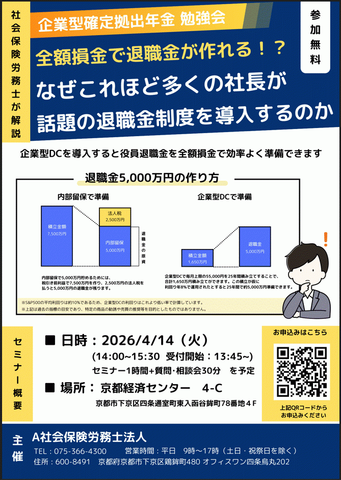 セミナー A(エース)社会保険労務士法人[トップページ] セミナー[一覧] 企業型DC勉強会 京都市開催 開催日時 2026年4月14日(火) セミナー一覧に戻る 全額損金で退職金が作れる!?なぜこれほど多くの社長が話題の退職金制度を導入するのか【企業DC勉強会】日 程:2026年4月14日(火)時 間:14:00~15:30場 所:京都経済センター 4-C京都市下京区四条通室町東入函谷鉾町78番地4F PREV NEXT